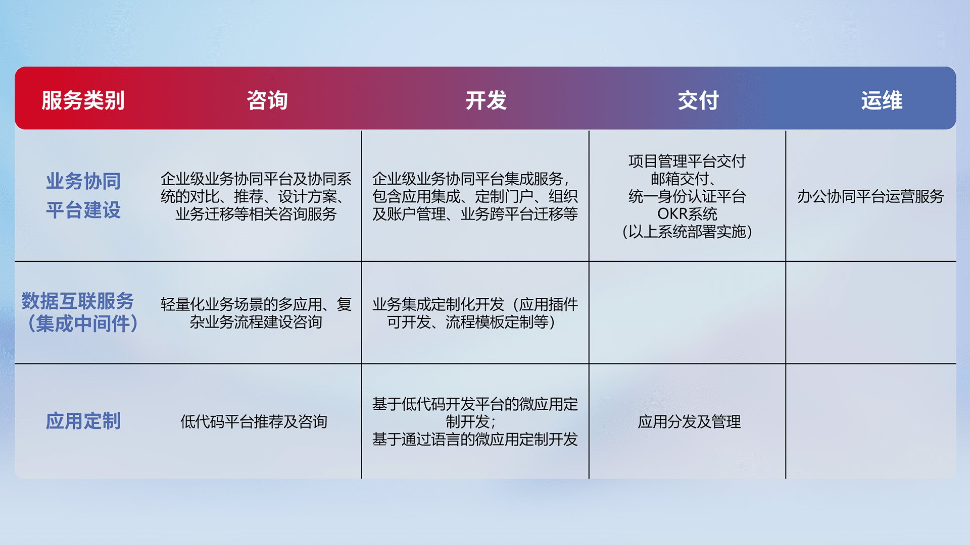 针对钉钉、、企微、、、、IDaas等平台级产品提供产品的规划、、方案、、、交付、、、、定制化开发等服务,,,,实现如统一协同办公、、、、智能客户服务、、、混合会议管理、、智能数据查询、、、等业务场景,,,,实现数字化转型。。。