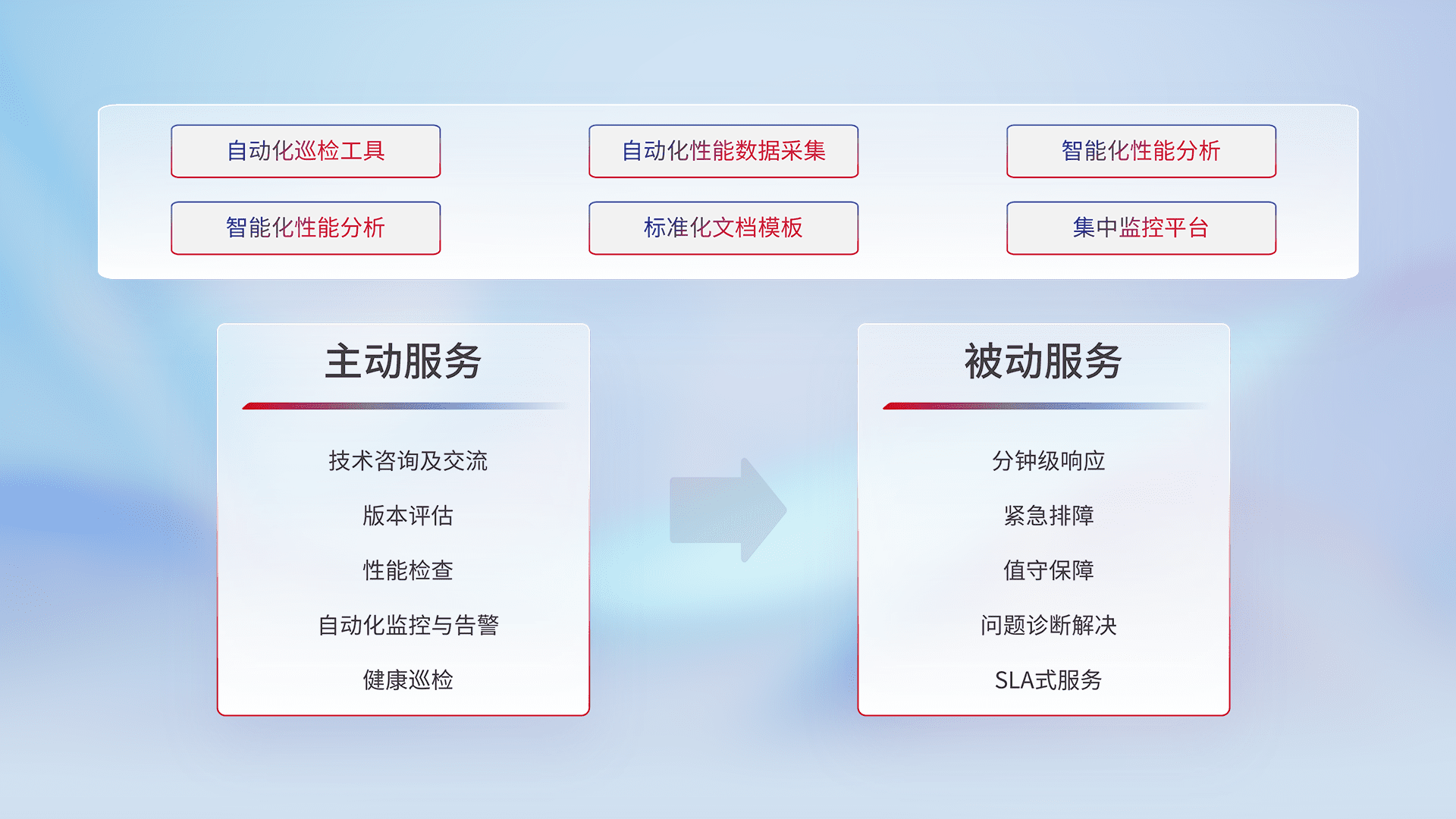智能化工具和标准化文档,,,,保障服务质量,,,提供主动服务(包含技术咨询、、、版本评估、、、、性能检查、、、自动化监控与告警、、健康巡检)和被动服务包含(分钟级响应、、、紧急排障、、、值守保障、、问题诊断解决、、SLA服务)。。。